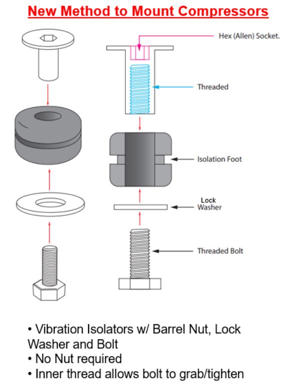 Our improved vibration isolators provide a cleaner mounting solution for your VIAIR compressor. The new 3-piece design has internal threads and a hex bolt for easier install and a self-contained look.